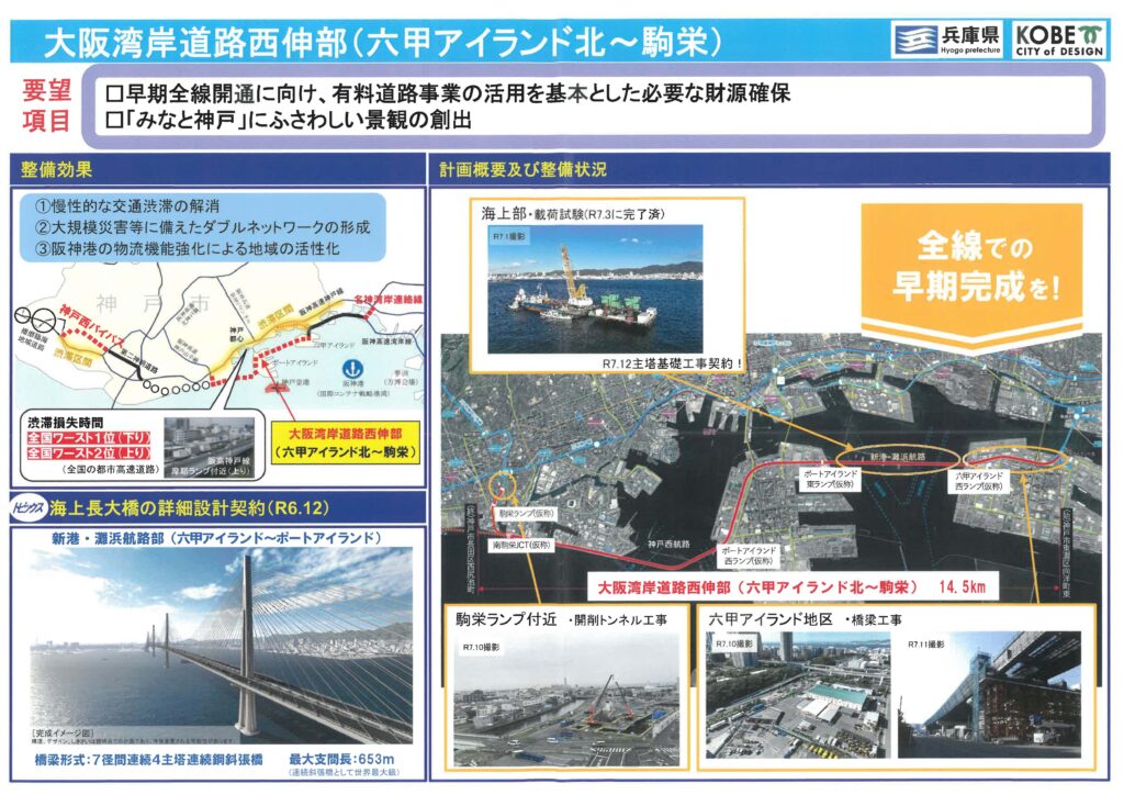 大阪湾岸道路西伸部については、海上部での載荷試験が完了し、いよいよ今月(令和7年12月)、海上長大橋の主塔基礎工事の契約が締結されました。